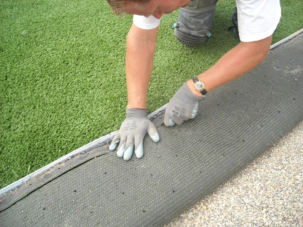 Una vez que la grama esté en su lugar, es hora de asegurarla. Utiliza clavos o grapas para fijar la grama al suelo. Esto es especialmente importante en áreas donde el viento pueda levantar la grama o en bordes donde pueda despegarse. Coloca las grapas cada 30 cm aproximadamente, asegurándote de que estén bien fijadas en el suelo. Después de asegurar la grama, puedes proceder a rellenar las juntas con arena o un material específico para grama artificial, lo que ayudará a mantener las fibras en su lugar y a dar un aspecto más natural.
